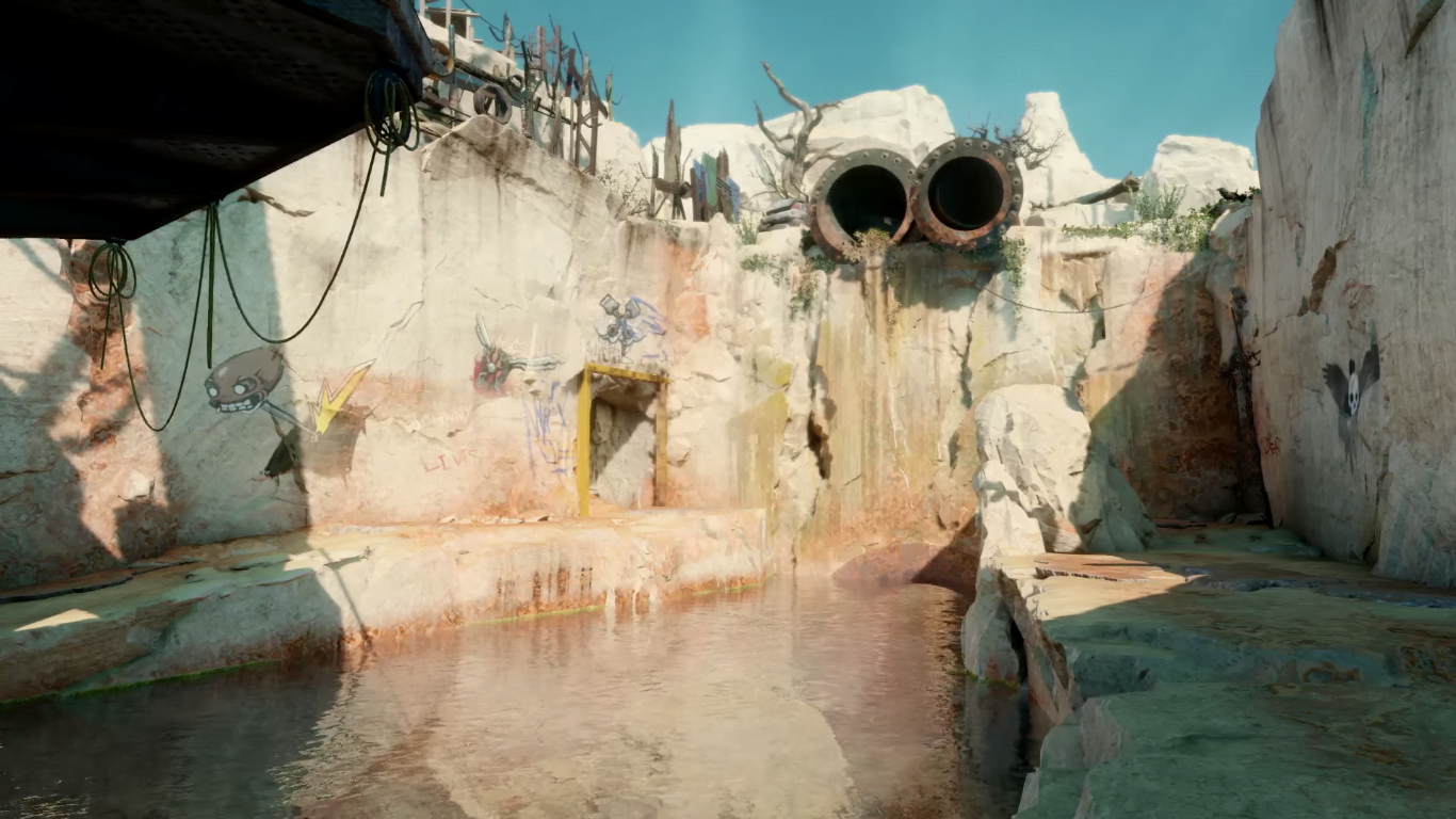 And from a clean and sterile white future, we go to an apocalypse future. It has very Mad Max-esque design and it’s pretty neat. The map feels a bit cluttered but I guess it’s okay since it’s Mad Max inspired map. This is one of those maps where the layout is way better than the design. You have the big bridge and underneath the bridge are small walkways and a big puddle of water for you and your enemies to splash in. The back of the map is a more traditional level with small structures and open areas. There is a cave section that looks cool, and leads to the water section. It’s a cool map with the water section being the highlight.
