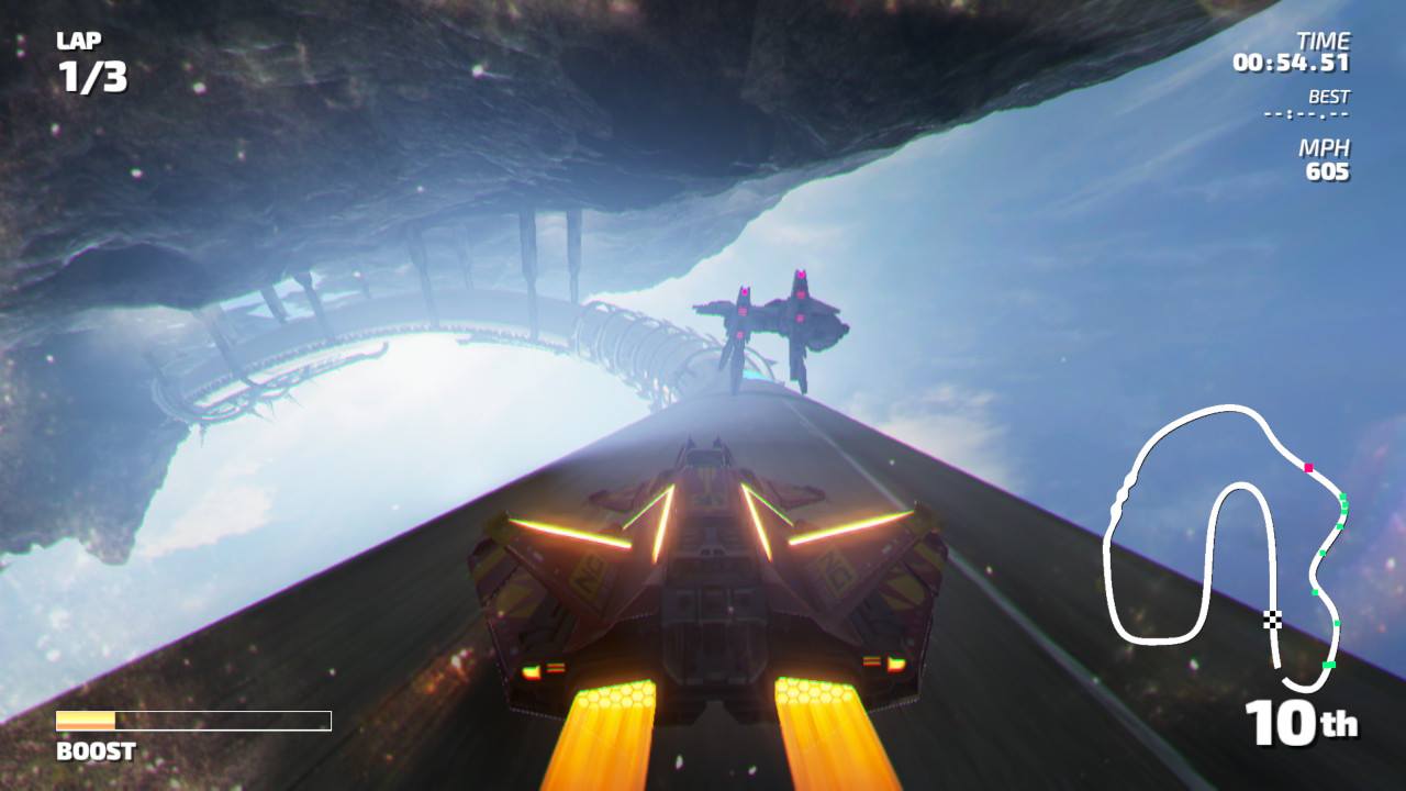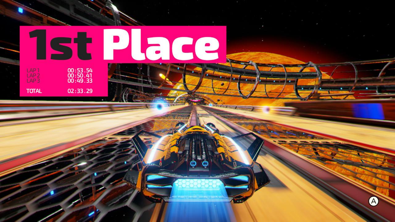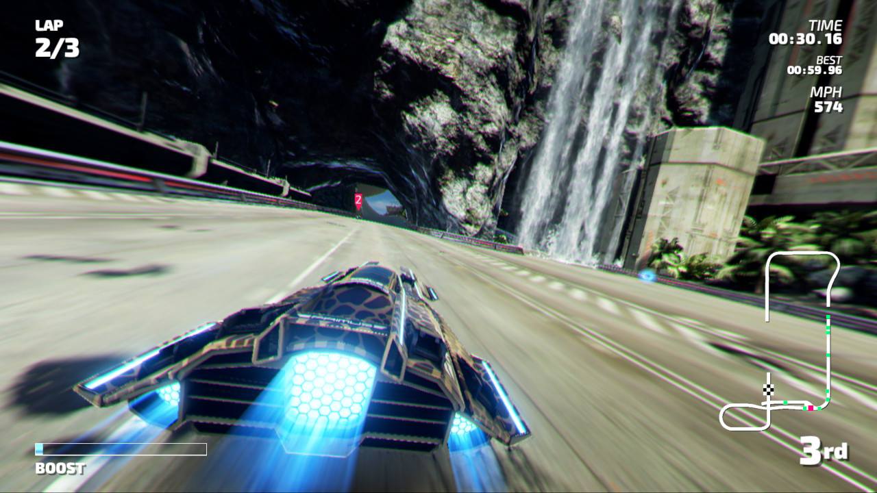 Every track feels different and they’re increasingly difficult. While the first cups offer protective railing you can grind against, so as not to fall down the track in a resulting ball of fire, the later cups won’t offer these railings and will thus not prevent you from falling off the edge to certain death. Luckily you spawn rather quickly during the Championship mode. So be wary to use your strafing controls! To go even faster the tracks will offer patches of orange or blue energy that will act as “boost patches” but you’ll have to ‘switch’ your engine energy to orange or blue accordingly with the X button (in normal controller mode) to match the energy signatures of the track. Otherwise the conflicting energy will result in an electrical failure that will slow down your vehicle instead of making it go faster and that will unforgivingly give the edge to other racers.