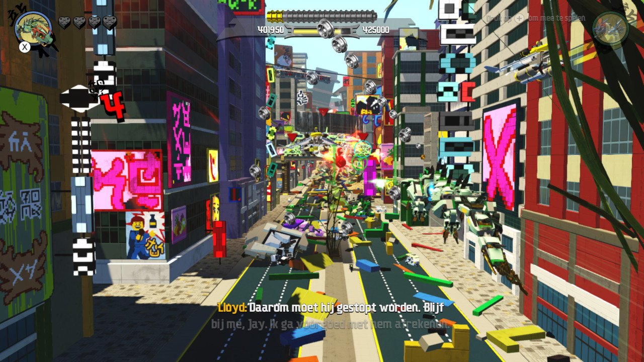 While I wished the gameplay would’ve been improved in LEGO Ninjago, it’s not a big issue for me. The gameplay, while simple, is still pretty solid and easy. However, I do have a big issue with a particular type of gameplay sections that are spread throughout the game. The vehicle sections in LEGO Ninjago are a visual mess. They play as an on-rails shooter but are visually so horribly designed that they are easily the worst part of the game. When you’re controlling your vehicle, the screen is filled with conflicting colors and way too many things happening at the same time. I often didn’t see the enemies I had to shoot until they almost passed me, making it look like they popped up out of nowhere. The game also expects from you to pay constant attention to the UI while going through this chaotic mess, which results in an even more cluttered screen. It’s a good thing that there are only a few sections like this in the entire game, otherwise, I would’ve just stopped playing.
