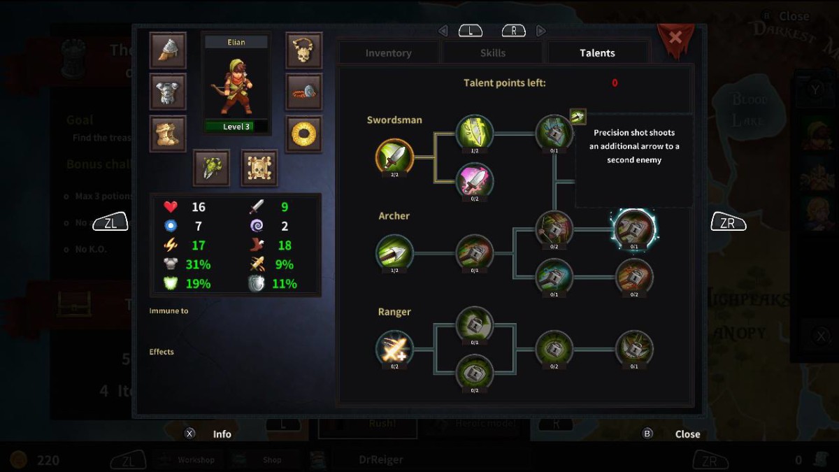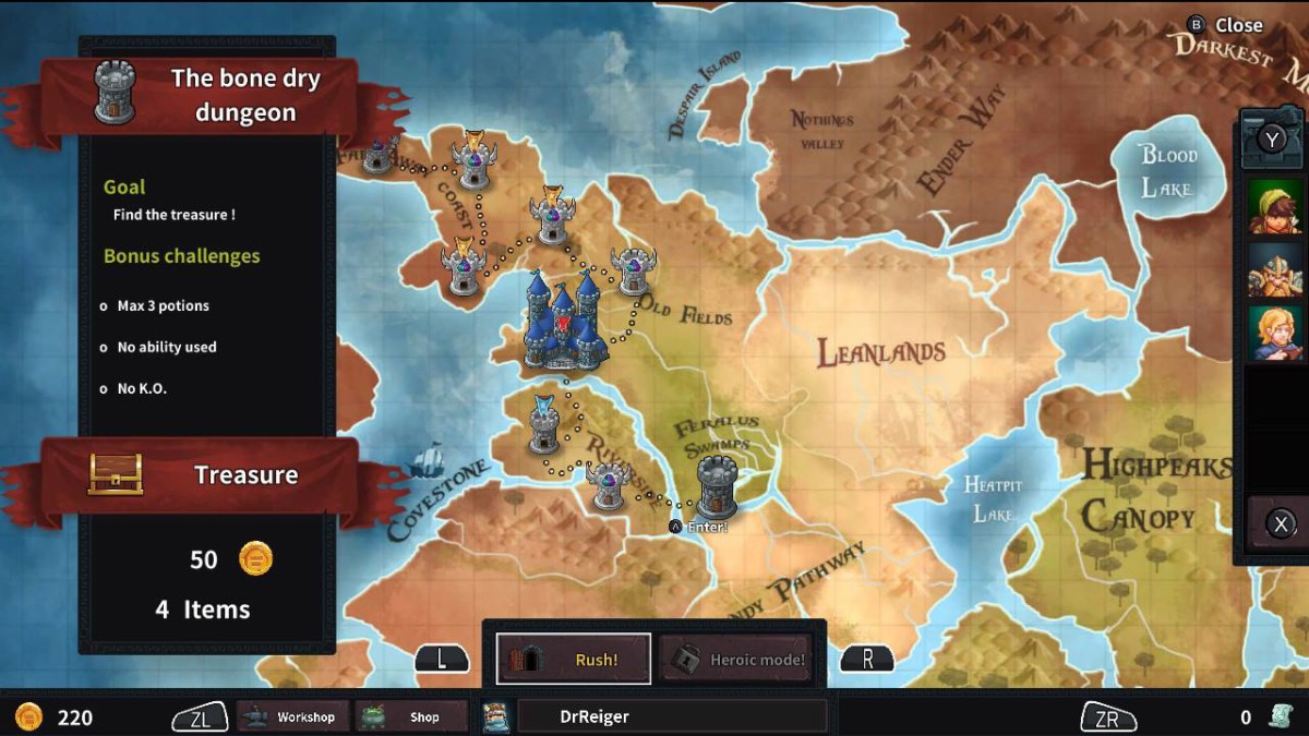 The pixely feel of the game is nostalgic, but we have seen better art on the Switch – and it’s strange they chose to get with such an art pallet. The concept art of the game and lots of the overworld art looks better than the in-game sprites. Dungeon Rushers uses a map system inside the dungeon, which reminded me of the old Dungeon Keeper (or more recent Impire) games. It’s a ‘top down’ view of the dungeon, in which a token of Elian hops around the map, triggering traps, enemies or random events. Each dungeon has it own bonus goals – such as No K.O.’s, or the maximum use of three abilities. Some of these feel really limiting, since some of the levels (especially after the first ‘boss dungeon), are way too hard without any proper leveling.