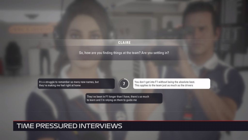This comes in the form of the interview system that takes place between races. Here, you’ll be put on the spot as the press quiz you about your performance. The kicker here is that the answers that you give will affect how you’re perceived by the F1 world, as well as how your own department sees you. This is achieved through dialogue choices and certain chances you taking during gameplay. Shout your mouth off and you may find yourselves in a touchy spot with your own team. It’s an interesting dynamic to say the least, and something I hope is maintained moving forward.
