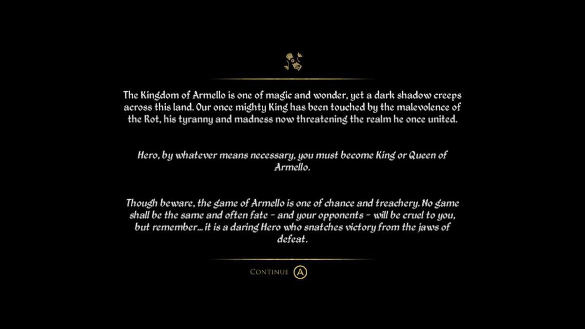 The game starts off with a cinematic prologue about the situation the land of Armello has found itself in. Something evil, known as the Rot, has taken over the mind of the king and turned him into a mad beast. Once a true lion, fighting for equality in his kingdom – the rot turned the lion into a mad man with a thirst for power and chaos. And guess what, it’s your quest to stop him from destroying the land you love.