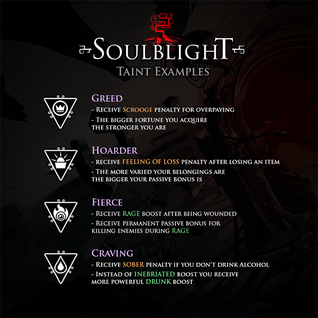 The gameplay concept of Soulblight is not that unique as they state. It follows a general approach, which won’t change for the rest of the game. Before entering each level of the Sanctuary you get to choose a Taint that represents a certain personality trait. That choice will shape your future experiences as each Taint unlocks a new way of gaining power (or make your run harder). It does add a certain amount of ‘choice’ to a run, since some traits demand special ways to tackle tasks. I’ll explain with some examples: