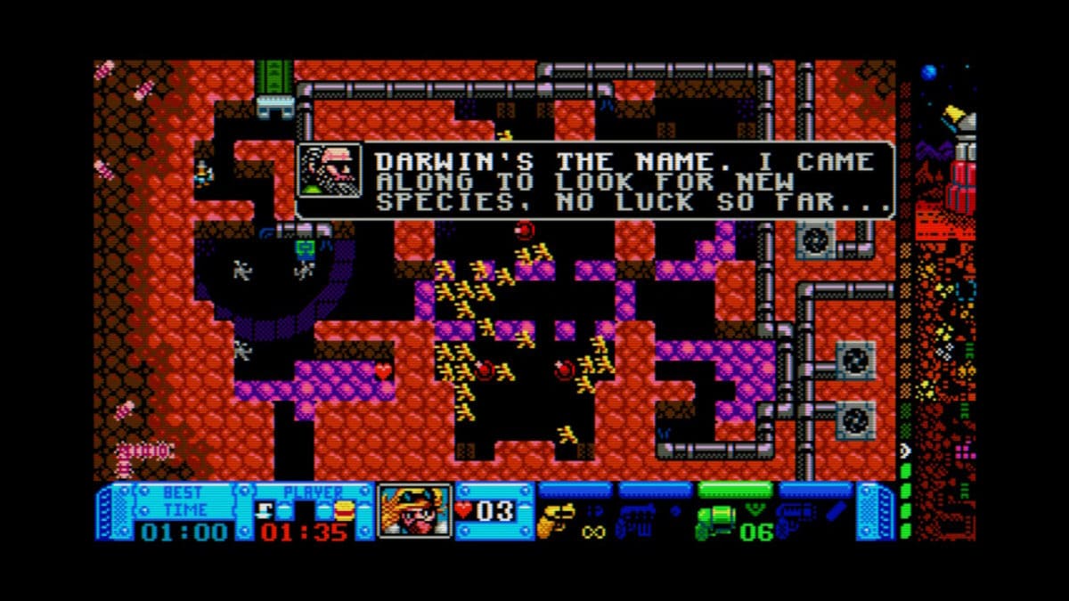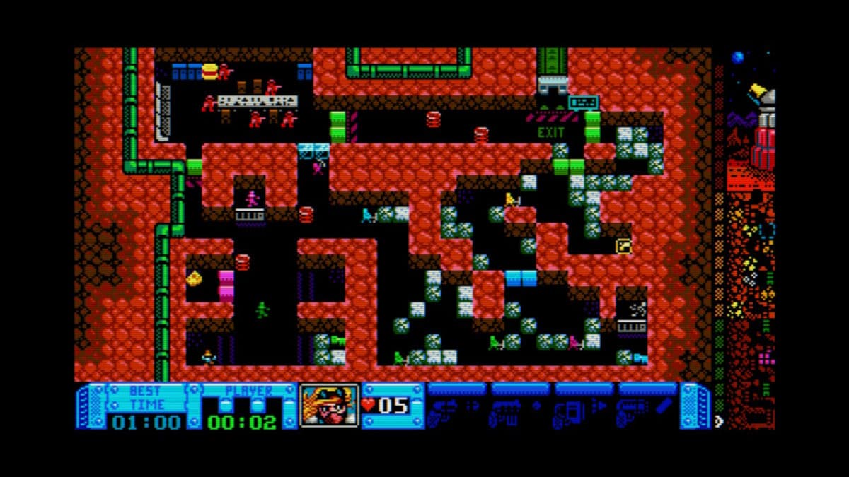 Locked up and afraid, you are forced to work in the darky rocky mines deep underground. This is where the gameplay takes a nice nudge at the old school games. Rock Boshers DX mixes the top-down feel of most arcade games of these era’s, and combines it with side-on action. It made me feel like I was playing an adventure-action version of Space Invaders (which is a good thing).