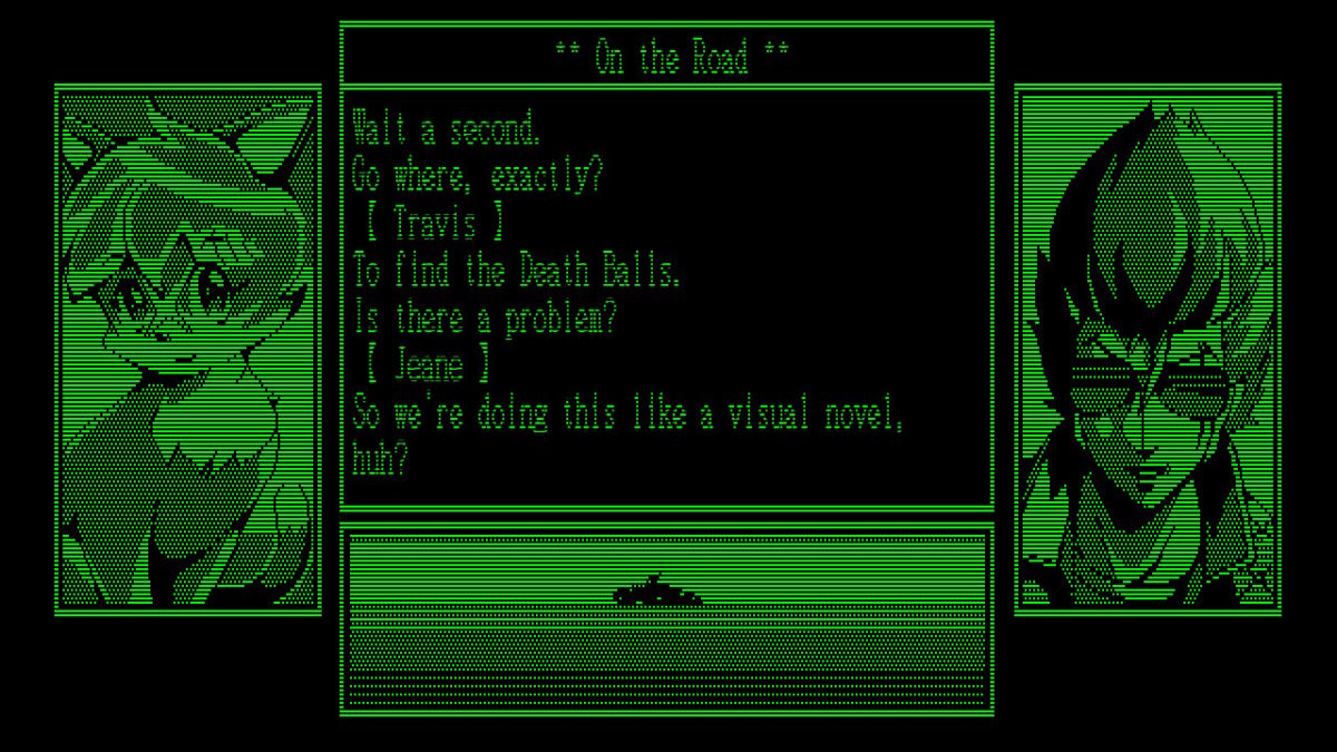 After completing a Death Ball game, you will advance in the story by using the motorcycle of Travis. This triggers the Visual Novel part of the game, which is, of course, a joke to Travis. He complains about using too much text (which would suffer localization). Or that people who thought they bought an action game can shove it (to put it lightly). I was surprised by the amount of thought that was put into these scenes to progress the story. Yes, they are a mockery of the visual novels of the world, but Travis does such a good job at mocking them, that it feels like an actual visual novel. Reverse psychology?