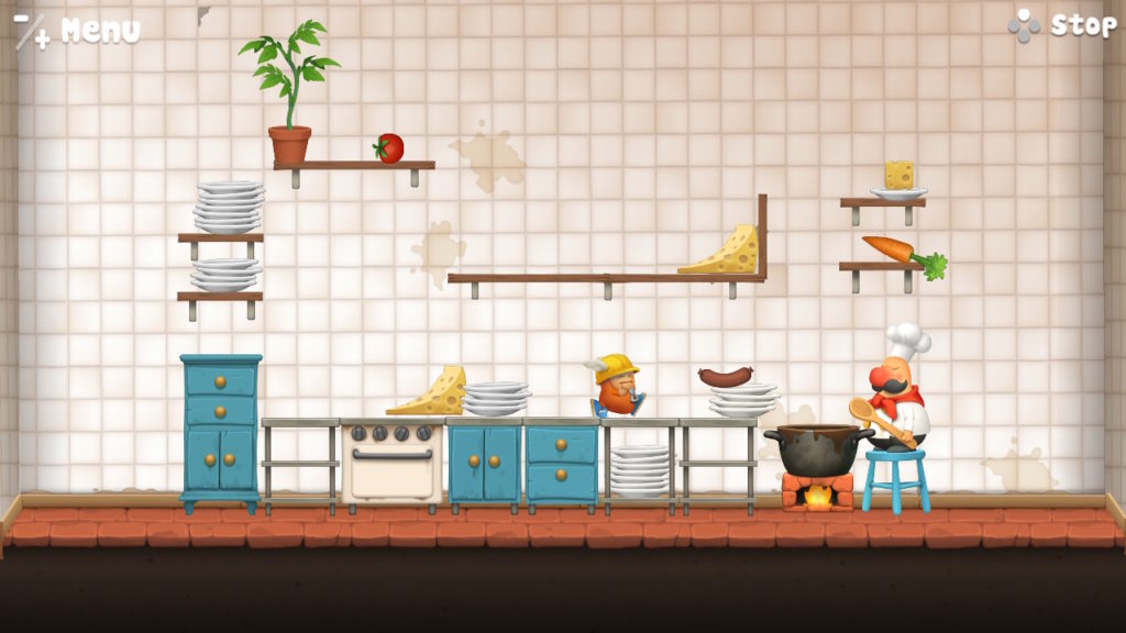 In Inventioneers the player gets presented a certain problem. These problems range from getting a baby in its cradle to adding a sausage to a stew. Underneath each scenario are certain objects like funnels, conveyor belts, helium filled balloons… that can be used to create a chain-reaction to solve the problem. For instance, an apple could be dropped on a character with a hairdryer, the character starts the hairdryer which sets a ball in motion to roll towards a basketball ring. While concocting your contraption the scenario is in pause mode. When you press play you get to see if your idea works or if it needs resetting to improve it.