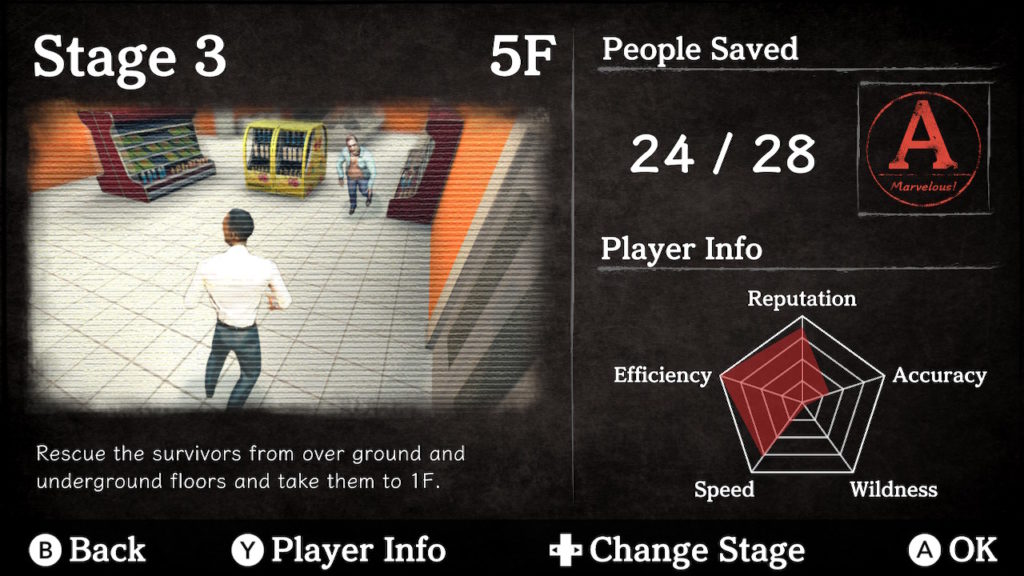 After all the survivors are saved or eaten by the undead, the game offers a summary of your performance. The chart presented, shows where there is still room to improve. The ultimate goal is to save everybody and getting a perfect score. Each new level adds more floors or a different layout to make it more challenging. Nevertheless, the gameplay is pretty dull throughout the game, despite the additions. After about a half hour I finished level 7 and concluded the game (with some perfect scores). Needless to say, this isn’t the most compelling and challenging of games available.