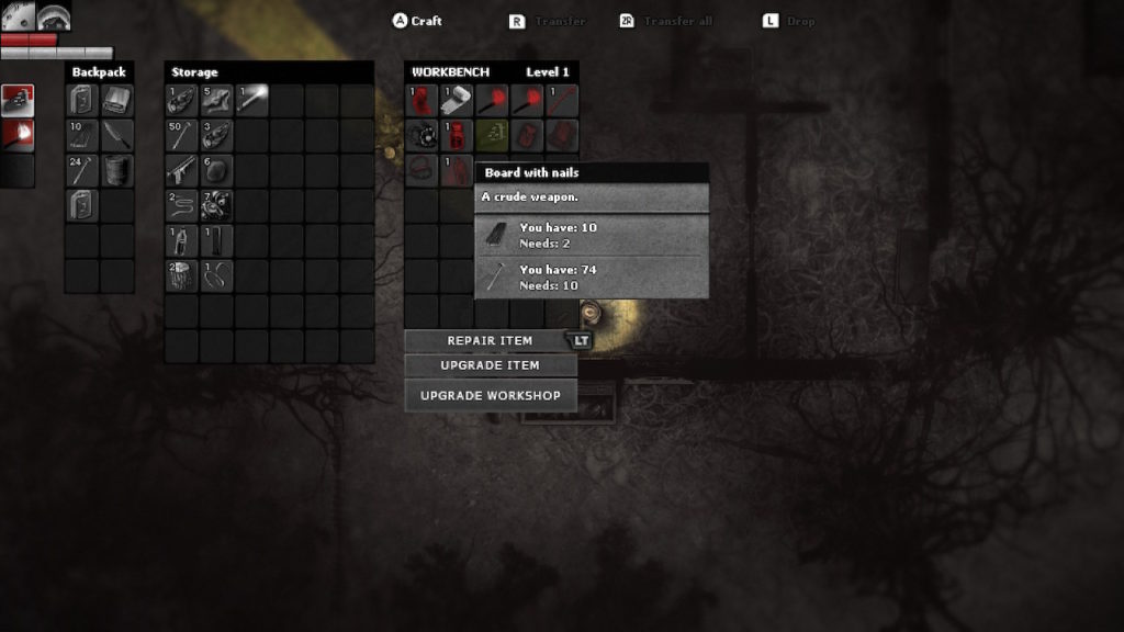 As mentioned before, Darkwood was originally a PC game. The transition made to port it to the consoles lacks a bit of translation in my opinion. It still feels like most actions would be much easier if you could use a mouse. The inventory management feels quite clunky which is a shame since you’ll be spending quite some time with it. The combat was another thing I found cumbersome and would be easier with a mouse. Besides these gameplay hiccups, the game suffered from slowdowns for no apparent reason. If this happened during a battle you were surely done which was extremely annoying.