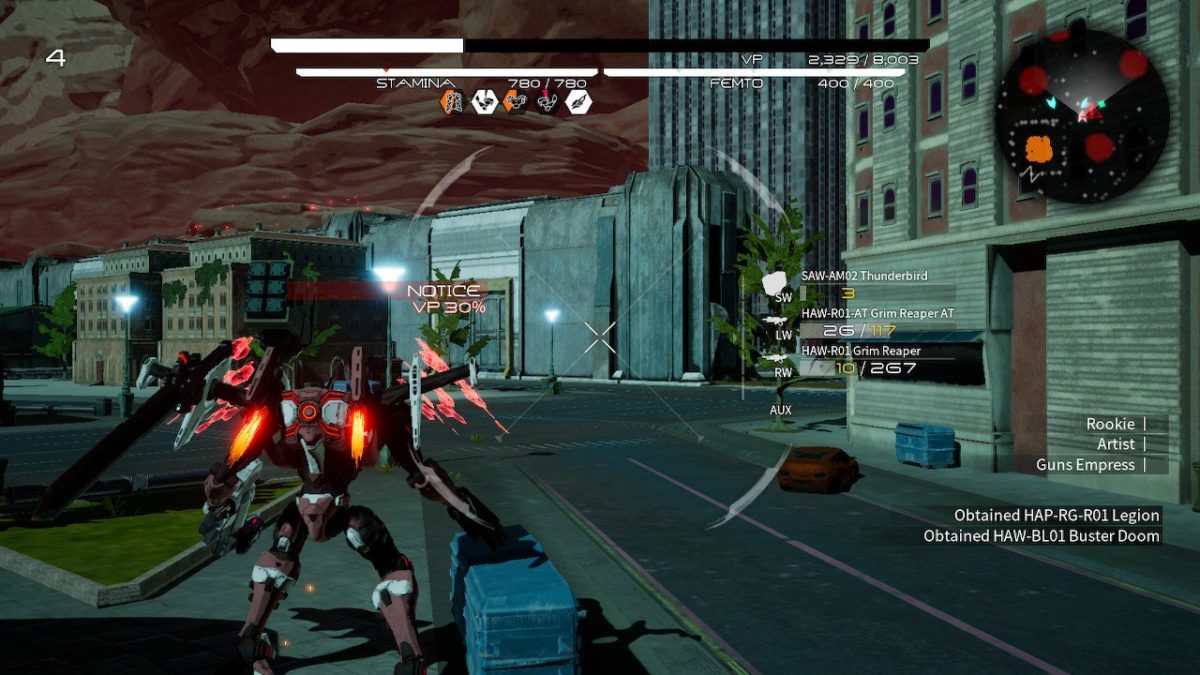 Set in a post-apocalyptic world, Daemon X Machina manages to set an interesting atmosphere. The moon crashed on the Earth and scientists did everything in their power to create the most powerful network of robots possible. This network should help humankind to rebuilt their world faster, a great idea, until the Immortals appeared. The Immortals hacked into the network and turned the robots against humans. What was meant to be the ultimate help resulted in the ultimate disaster. Instead of rebuilding their homes, humankind has to fight for their survival until the bitter end. It’s during this endless war that your story kicks off. You’re part of the Reclaimers, an elite group of mercenaries who are tasked to take out the corrupted robots and their masters one by one. It’s not an easy task and the world you’re dropped into doesn’t offer you a warm welcome. Right from the start, you’ll have to give it your all. You’ll have to adapt to overcome your challenges, you’ll have to invest in new weapons and new gear. Your Arsenal suit will become your second home and you’ll have to fight in order to survive. It’s a rather basic and maybe even predictable story but it does the job rather well. It gives you an excuse to jump from mission to mission, always defeating new waves of enemies.