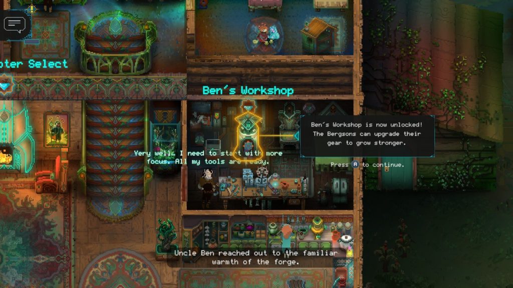 Children of Morta is a bit of a weird game, you got a game with a very strong story and impressive narration on one side and kind of bland gameplay on the other. As the story progresses, you learn all about this God and what origins came to make the events happen. The narrator is a true professional and creates such a nice atmosphere that you almost consider yourself part of the Bergsons family.