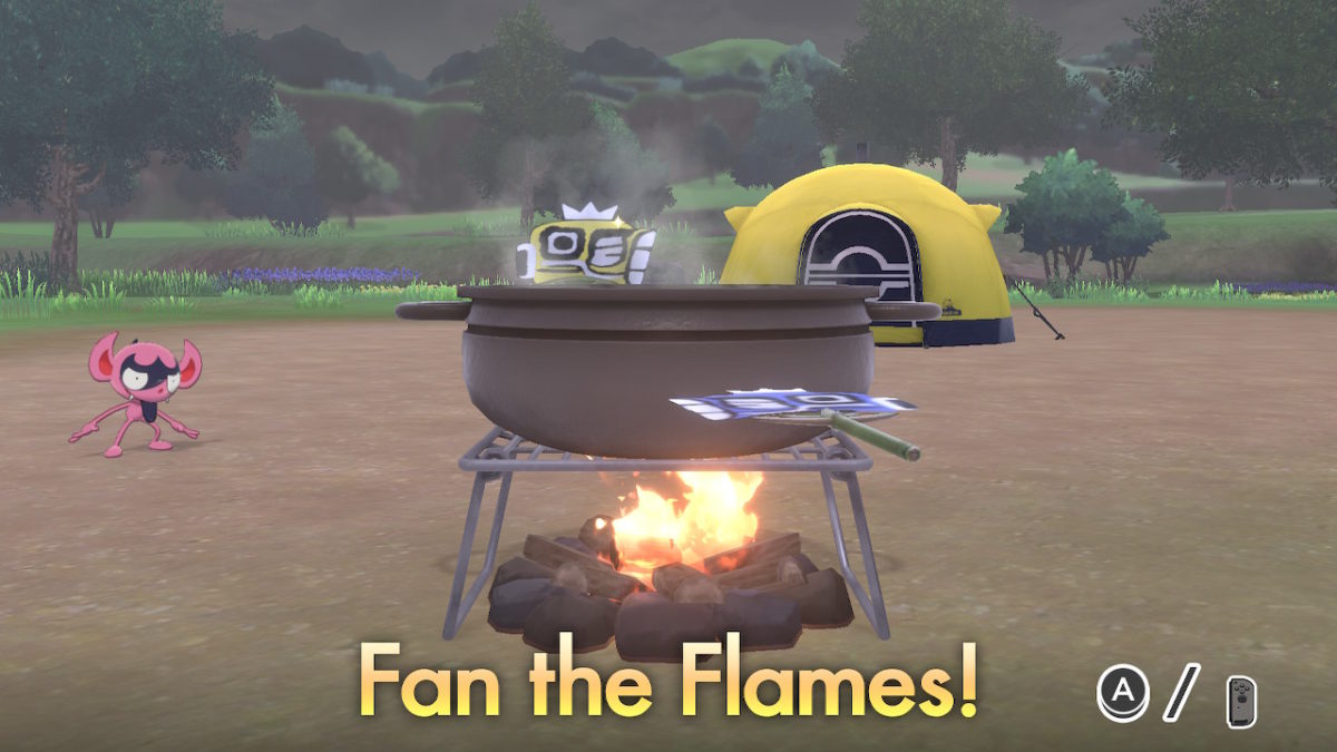 First I was a bit skeptical about this cooking part but it is a fun addition and it’s the only way to heal your team in the Wild Area besides items such as revives or potions. There’s no Pokemon center in the Wild Area and setting up camp to cook is the only way to heal your allies among the sometimes overpowered monsters. If you manage to defeat an overpowered Pokemon you’ll gain a massive amount of experience points but you’ll never be able to catch it and add it to your team. This makes it actually balanced and you’ll want to take the risk sometimes to get some experience points. Playing with your Pokemon while setting up camp will also give you some experience to level up. If you want to boost more be on the lookout for white beams in the Wild Area that will host another player’s camp. Here you can even cook together with total strangers and play with both Pokemon teams to get even more experience points. One side-note, this is still a Pokemon game on a Nintendo Console so the interaction with the random strangers in the Wild Area is limited to cooking, playing with their Pokemon and getting preset messages like “Konichiwa, I found this ingredient in my bag”. So it’s still all safe and child-friendly!