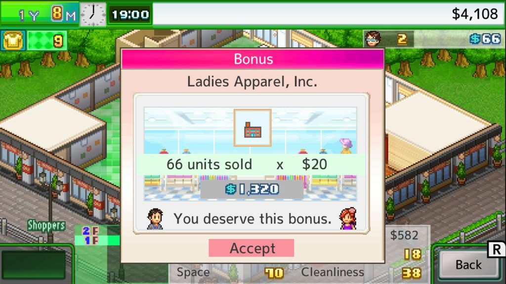 At the beginning of the game, you start with a two-story clothing store and a total of six clothing goods. To acquire more goods, you must purchase them from clothing companies with medals, a special currency that is harder to acquire than money. These medals are earned by completing in-game challenges or selling stylish combos to customers.  As the game goes on, you gain access to more and better goods.