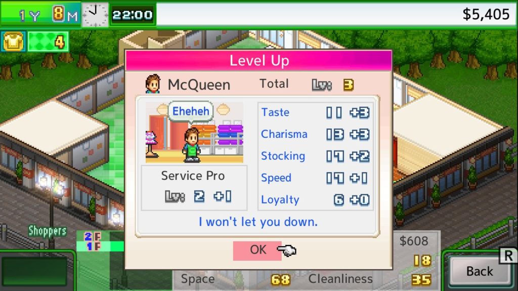 What makes Pocket Clothier stand out is that each piece of clothing has its own set of stats that can be modified using items. Clothing stats are further modified by the stats of the display they are placed on. If you group certain items together you will get even more points, which will result in even more profit. I decided to run a man- and woman store, with a separate floor for both. This way I had the room to create great combinations and earn enough revenue to buy a third floor.