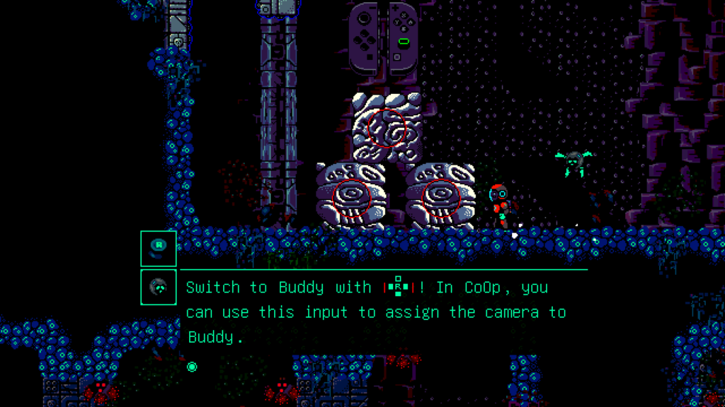 Calling Outbuddies DX a Metroidvania seems obvious since it actually looks a lot like the first Metroid game. Even the “doors” are copied out of the classic NES game. On the other hand, I had some trouble with the way the game evolves in the first few hours. After about an hour of gameplay, you already learned most of the abilities available in the game. There is some exploration needed to further perfect these abilities but you’ll be juggling abilities right from the start. I like to be eased into these sorts of “special moves” more as I discover more of the world. This ultimately comes down to personal taste but I felt the pace of this game was very off-balance in regards to the whole Metroidvania label.