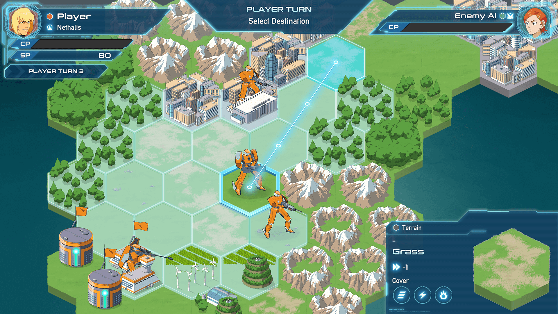 Choose from four commanders, each representing a different faction and bringing with them their own unique power, traits, and playstyle. Think tactically as you move your units, clash with rival mecha, and watch the outcome in dramatic battle sequences inspired by 90s Japanese animation.