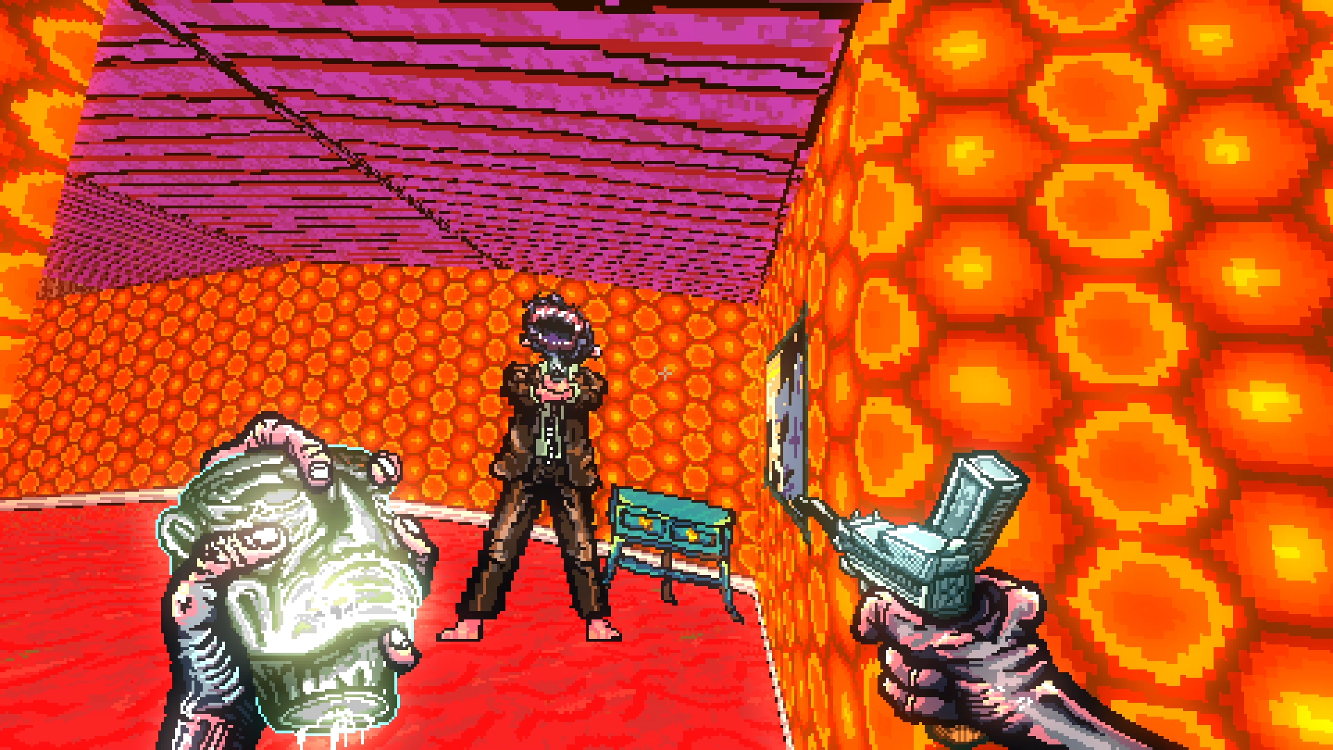 The powerups vary from having more ammo per clip, more health in your container to straight-up changing your gun for a shotgun, an uzi, or even a knife. You have to choose one of three randomly picked powerups per level. To get to the end of the level you need to aim, run, slide, and jump your way to the end all while going through a fever dream of a décor.