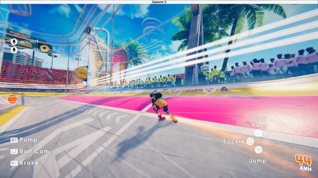 Inspired by Roller derby, which is truly a brutal niche sport you have to see at least once, Ubisoft added all sorts of ways to stop the opposing team. Tackles, roundhouse kicks, uppercuts, and even diving headfirst into your opponent, are all means to take back control of the ball and build up your team’s lap counter. Timing these moves feels quite hard initially but with some perseverance, you’ll get the hang of it. The team in control of the ball will obviously do their best to protect the ball and use these same moves in order to counter your attacks. The ball carrier is a bit more limited with only a dodge move at his/her disposal.