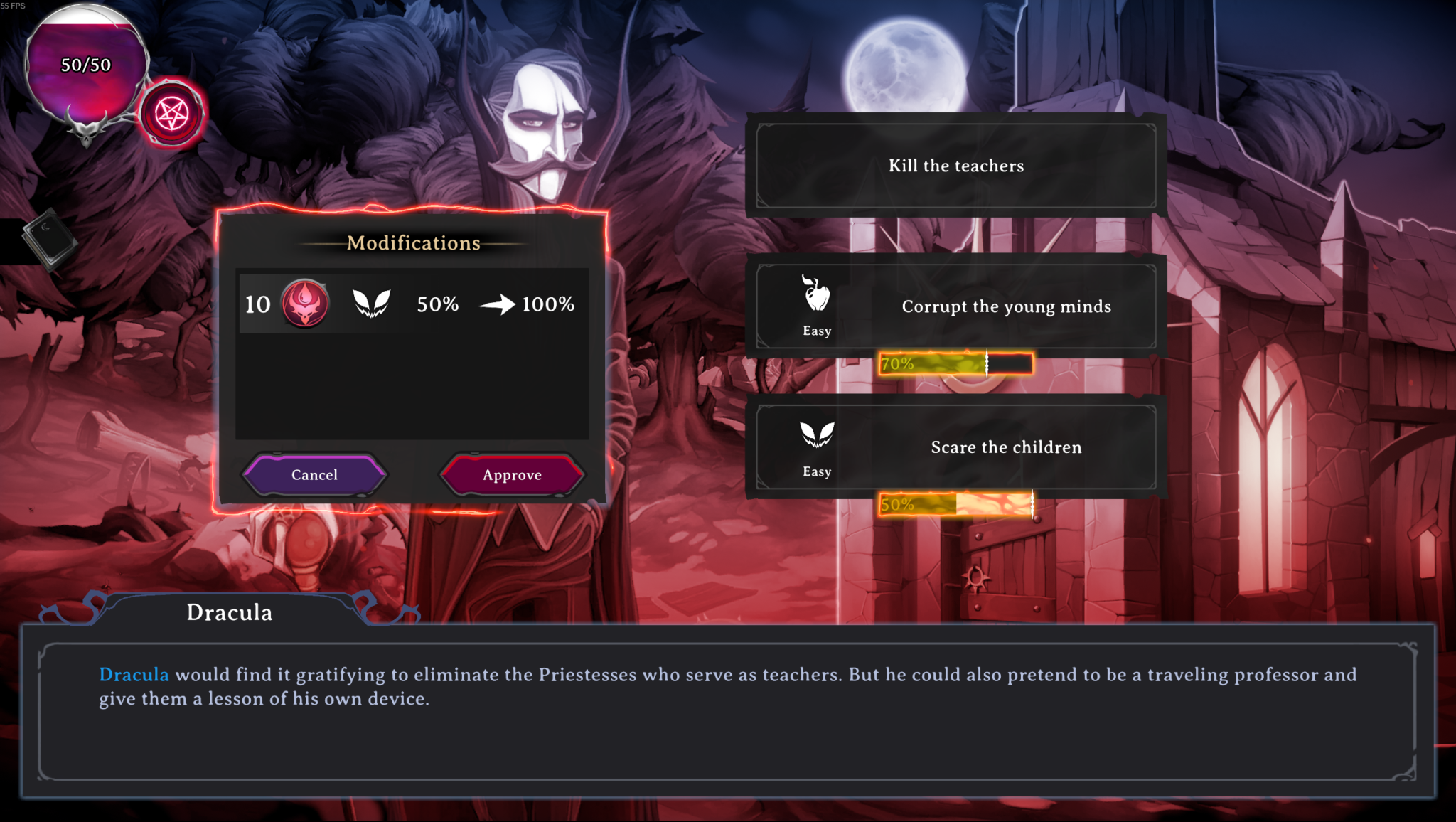 The game has a couple of cool mechanics. One being the turn-based combat that is affected by ‘Action Points’ or AP. So, you can attack as long as you have AP left. Next are the events where you encounter a gravedigger, some witches, or a Demon slayer to be that is still trying to find his way. You can then choose how to deal with these interactions. Will you scare the living s*** out of the demon slayer to dissuade him from slaying your friends? Or do you help the witches escape the inquisition? Each of the possibilities relies on a percentage chance of success. And if you don’t agree with the percentages…. Change them, you’re the devil, who will stop you?