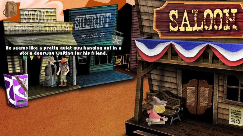 The western backdrop is the ideal ground to populate it with odd characters. The guy who lost his feet, the eery undertaker, and even the mustache-bearing bartender… all look pulled out of a classic Western. The addition of popular culture references makes this game fun to just explore. When you first enter the town you can see a guy standing in front of the store resembling Kevin Smith’s alter-ego Silent Bob. When talking to him you get presented with a message saying he doesn’t seem like a talkative person and is probably just waiting for his friend. These small nods to popular culture aren’t too obvious which makes it fun to spot them. The more talkative characters offer many options to interact with, all filled with humorous responses.