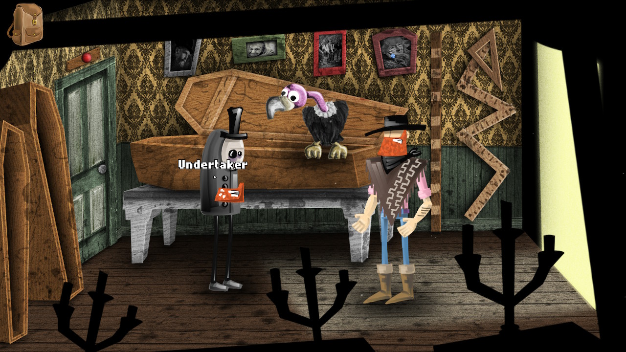 The western backdrop is the ideal ground to populate it with odd characters. The guy who lost his feet, the eery undertaker, and even the mustache-bearing bartender… all look pulled out of a classic Western. The addition of popular culture references makes this game fun to just explore. When you first enter the town you can see a guy standing in front of the store resembling Kevin Smith’s alter-ego Silent Bob. When talking to him you get presented with a message saying he doesn’t seem like a talkative person and is probably just waiting for his friend. These small nods to popular culture aren’t too obvious which makes it fun to spot them. The more talkative characters offer many options to interact with, all filled with humorous responses.