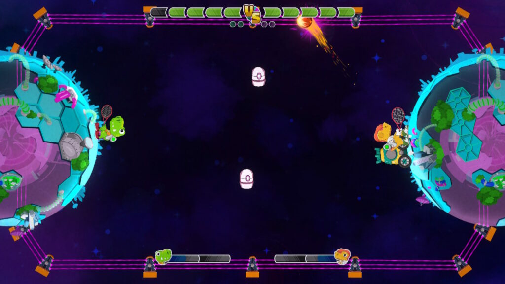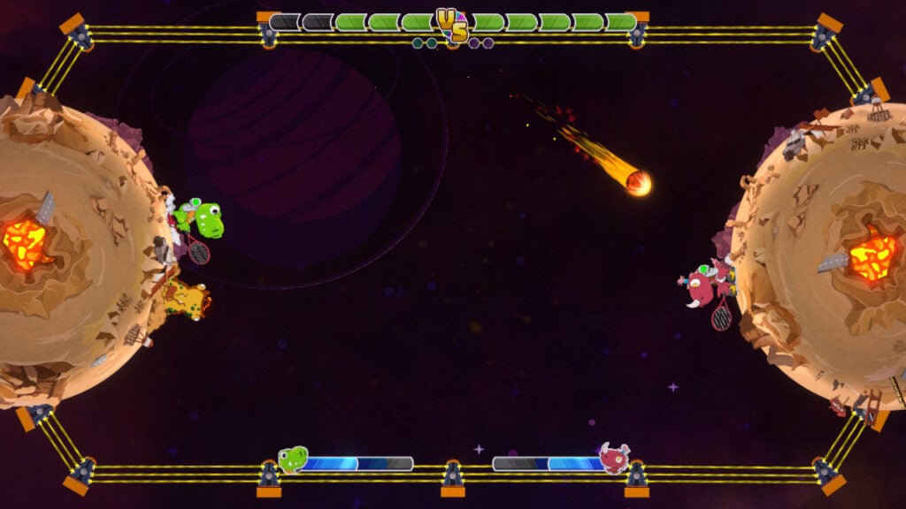 The game has a story mode that sets you out on a journey across the galaxy to compete in order to earn badges. Along the way, you’ll meet many quirky-looking dino-inspired characters. Some are quite friendly and give advice while others only want to destroy your dreams of ever becoming the best at dino galaxy tennis. Defeating opponents advance the story but also unlocks characters and arenas to use in the VS mode. It’s also the best way to learn about all the different ways to attack the meteor and get used to the different types of power-ups and specials each planet has.