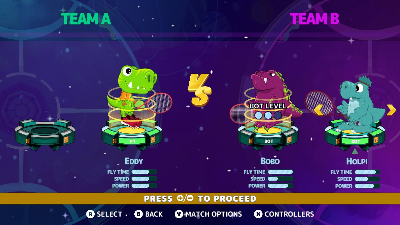 The game has a story mode that sets you out on a journey across the galaxy to compete in order to earn badges. Along the way, you’ll meet many quirky-looking dino-inspired characters. Some are quite friendly and give advice while others only want to destroy your dreams of ever becoming the best at dino galaxy tennis. Defeating opponents advance the story but also unlocks characters and arenas to use in the VS mode. It’s also the best way to learn about all the different ways to attack the meteor and get used to the different types of power-ups and specials each planet has.