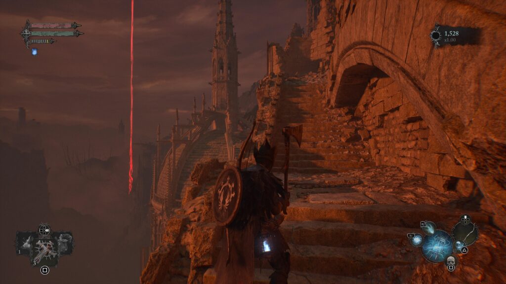 Another new mechanic introduced is the Umbral lamp you carry with you. In Mournstead you spend your time in the Axiom which is the land of the living. The Umbral is the parallel realm representing the land of the dead. The Umbral lamp grants you the ability to switch between these worlds. This makes for a few unique gaming experiences. Some paths might be blocked in the Axiom world and can only be passed by switching to the Umbral world. Exploring the world has to always be done in both worlds in order to get the best out of your time in Lords of the Fallen. Going to the Umbral has an obvious drawback in the fact that the enemies are much harder. With each minute spent in the Umbral, your presence gets known to the demons. Staying in the Umbral for longer periods might get you more experience but is also likely to get you killed. Escaping back to the Axiom can only be done when reaching certain beacons within the world.
