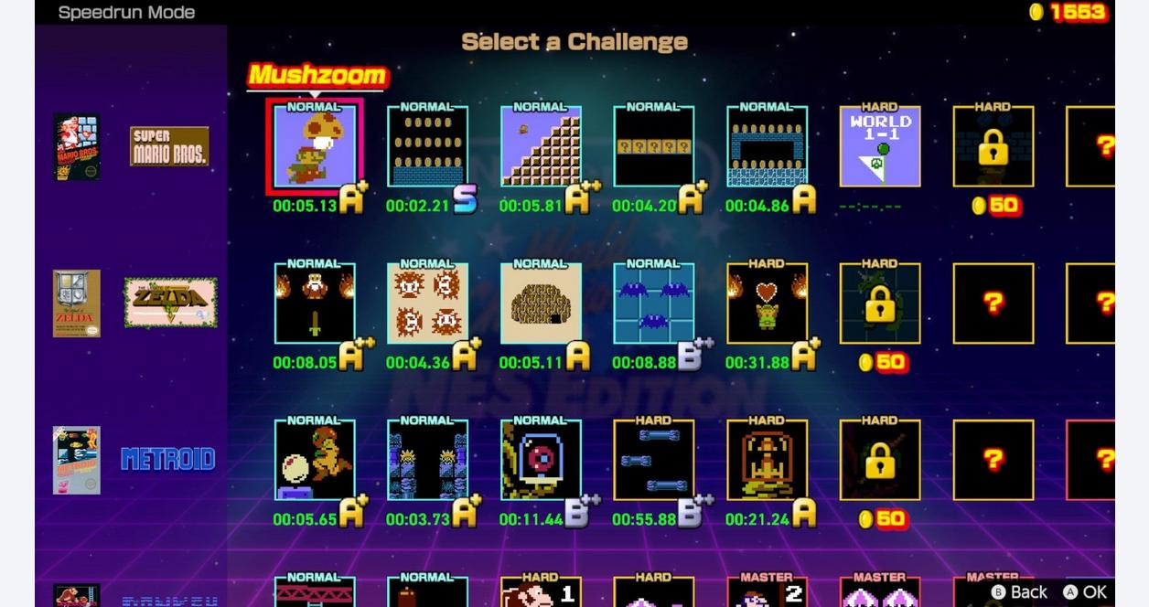 Nintendo World Championships: NES Edition is the next evolution in the World Championships and currently offers 150 challenges divided over 13 NES games. Classics like The Legend of Zelda and Super Mario Bros. are part of the collection but you’ll also play the lesser known franchises like Ice Climbers and Excitebike. If you grew up with the Nintendo Entertainment System, this is one big trip down memory lane and I highly recommend playing this game with the special NES Joy-Con to make it feel more authentic. If you’re a newer Nintendo fan, you’ll certainly appreciate the first Nintendo games and the challenges that came with them. The goal of the game itself is to clear a challenge as fast as possible. The faster you clear the challenge, the higher your rank. Clearing challenges will reward you some coins, these are needed to unlock the next set of challenges. It’s all pretty straightforward but that doesn’t mean it isn’t fun to play. What I like most about this is the variety of challenges. It ranges from extremely easy ones like ‘enter this door’ to more complex ones like ‘finish this level as fast as possible’. The level of difficulty is clearly stated on the top of each icon and although it might feel too easy, wait until you try the master challenges, even the most experienced Nintendo veteran will struggle with those. The speedrun mode is a great way to sharpen your skills but it gets more interesting when you start competing with others.