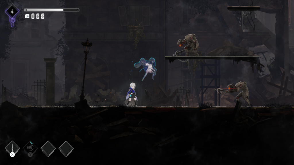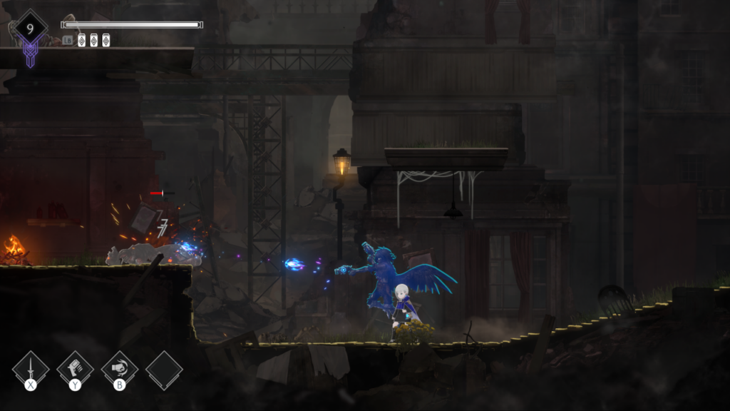 From the moment you step into Ender Magnolia’s ruined landscapes, a sense of overwhelming desolation oozes from the screen. The world feels abandoned, with crumbling structures, mist-covered streets, and decayed remnants of a once-thriving civilization. The muted colour palette, dominated by shades of grey and deep blues, is punctuated only by the eerie glow of Magicite-infused relics and the spectral forms of Lilac’s allies. Each area is uniquely crafted to reflect the despair of a world teetering on the brink of oblivion, making every step forward isolating yet immersive. The boss designs stand as the game’s most striking visual achievement, each one a grotesque, haunting spectacle reminiscent of a 2D interpretation of Bloodborne and Souls-like monstrosities. From fallen guardians twisted into unrecognizable horrors to winged abominations radiating barely contained fury.