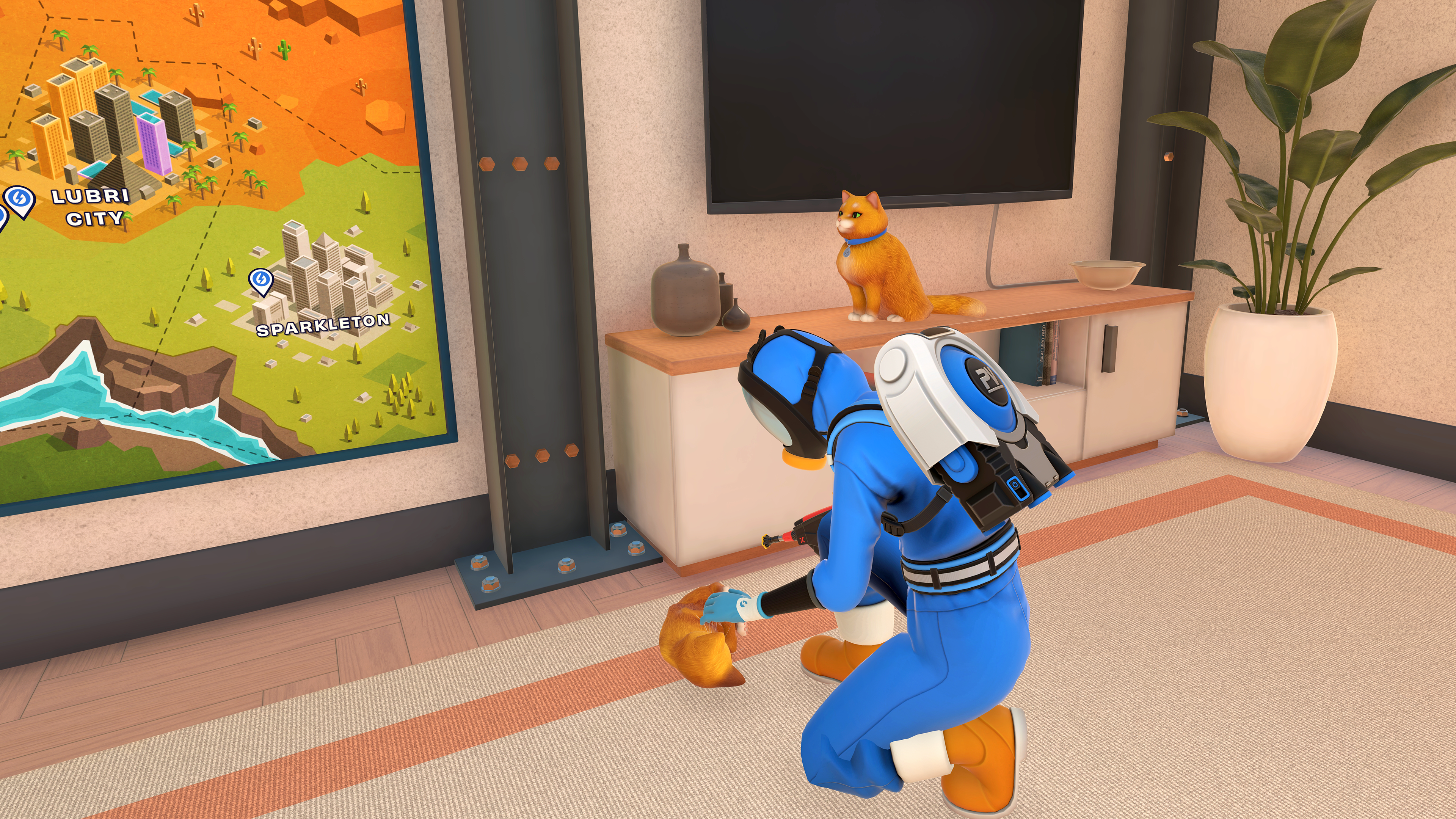 One of the most significant additions is the new home base, which acts as both a hub and a playground. It’s not just a fancy menu, it’s a fully explorable space that grows with you. You can customize furnishings (which you need to clean first, obviously), display trophies from completed jobs, and even pet the trio of cats (Ulysses, Bubbles, and Squeak) who follow you from the first game. It’s a slight touch, but it reinforces the game’s heart: this isn’t about power or prestige, it’s about pride in a job well done. Even the act of furnishing your space becomes another layer of self-expression. The home base also doubles as a social area for multiplayer sessions, letting players gather before heading out on jobs. The Caldera County map upstairs serves as a visual representation of your progress, a satisfying way to track the growing reach of your power washing empire.