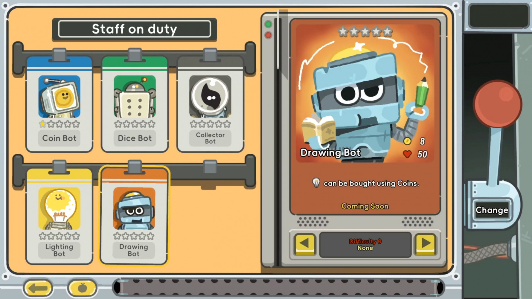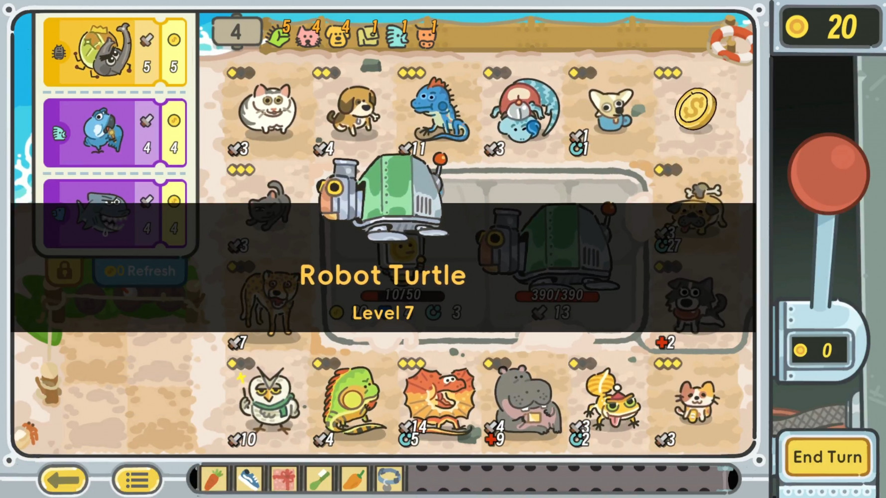 During your turn, you can either buy animals to place on the board or pull the lever on the right of the screen to spin the wheel. Both of these processes consume coins. These can be earned by triggering certain animals or objects on the board. If you cannot pay to pull the lever anymore, or if you choose to do so early, you can end your turn. Once your turn has ended, the enemy will attack you, but the one-armed bandit’s price will reset to zero and the shop will be filled once again with cute or silly animals to help you fight back against your robot opponent.