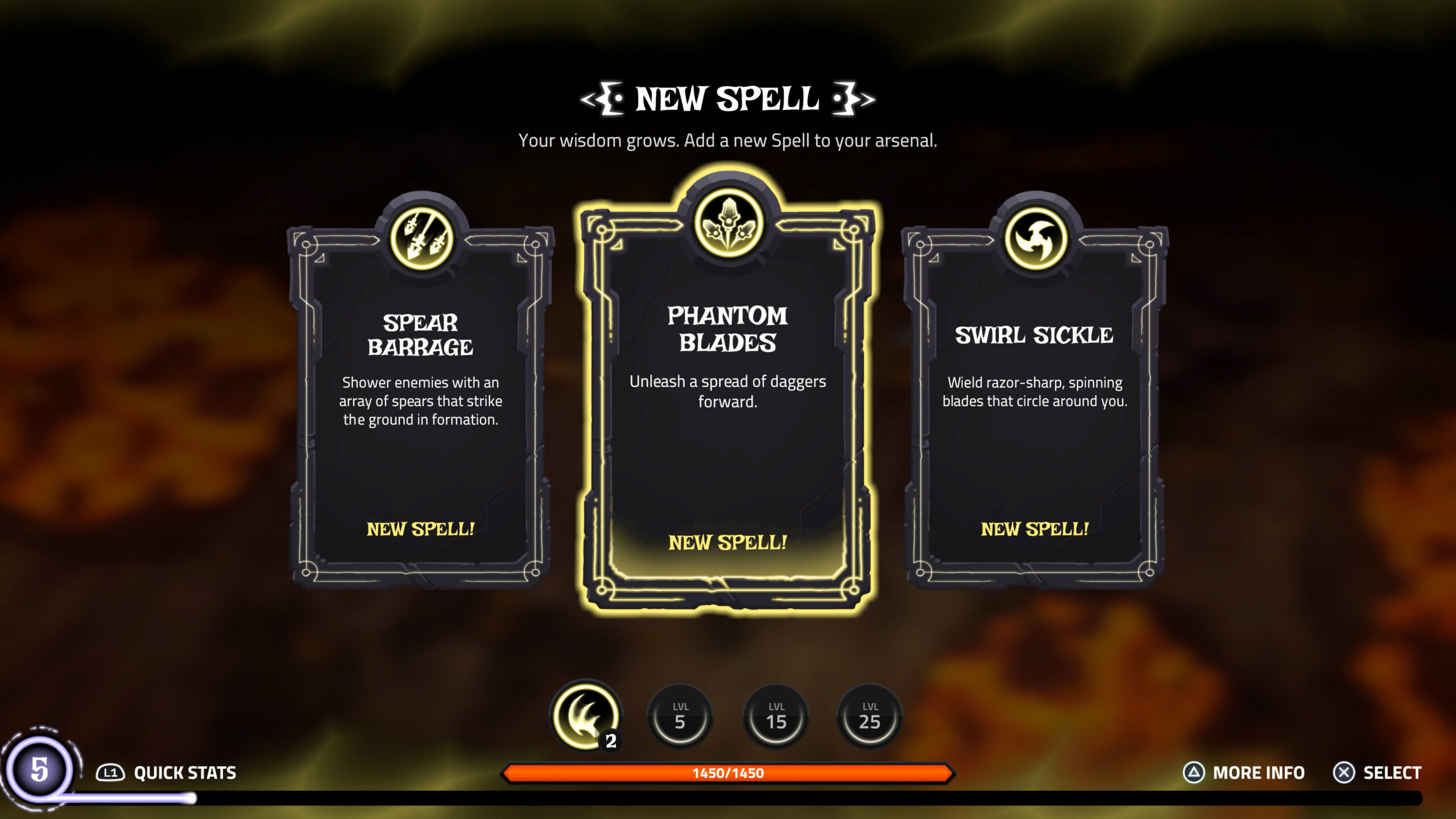 In The Spell Brigade, players control a wizard or witch on a quest to eradicate enemies from a chosen map. As in other roguelite survivor-likes, you can get permanent unlocks over the course of multiple runs. You choose a character and are dropped into vast open maps swarming with enemies. Each playable character attacks automatically, with the starting attack varying from character to character. Reginald, the wizard apprentice, for example, shoots magic orbs at enemies, while the sun mage surrounds themselves with a damaging zone, and the moon mage shoots a moon-shaped boomerang. The enemies you slay drop magical mana, which is used to level up your character. Gaining a level always gives you three choices for upgrading your character. These can be extra health, armour, or modifications for your wizard weapons.
